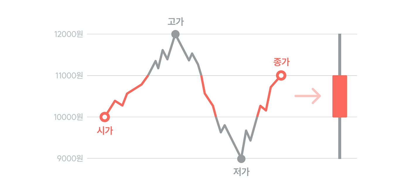1만 원에 시작해 → 1만 2000원까지 올랐다가 → 9000원까지 내려가고 → 1만 1000원에 마감