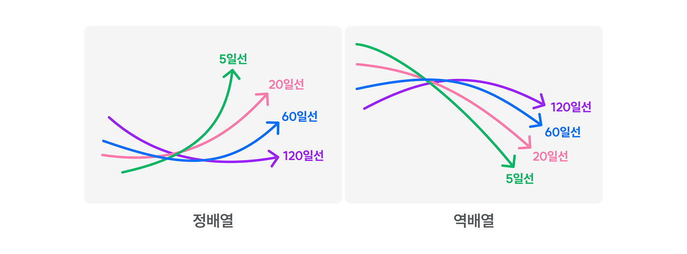 단기 이평선이 맨 위에, 장기 이평선이 맨 아래 배치되어 있는 상태를 말한다. 이는 최근으로 올수록 평균 주가가 올랐다는 의미이다. 정배열 구간이 길면 길수록 주가가 꾸준히 상승한 것이다.