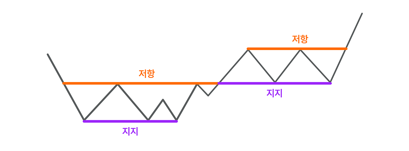 또한 저항 가격을 뚫고 올라가면 해당 가격은 새로운 지지 가격으로, 지지 가격을 뚫고 내려가면 새로운 저항 가격으로 변할 가능성이 크다는 점을 기억해야 한다.