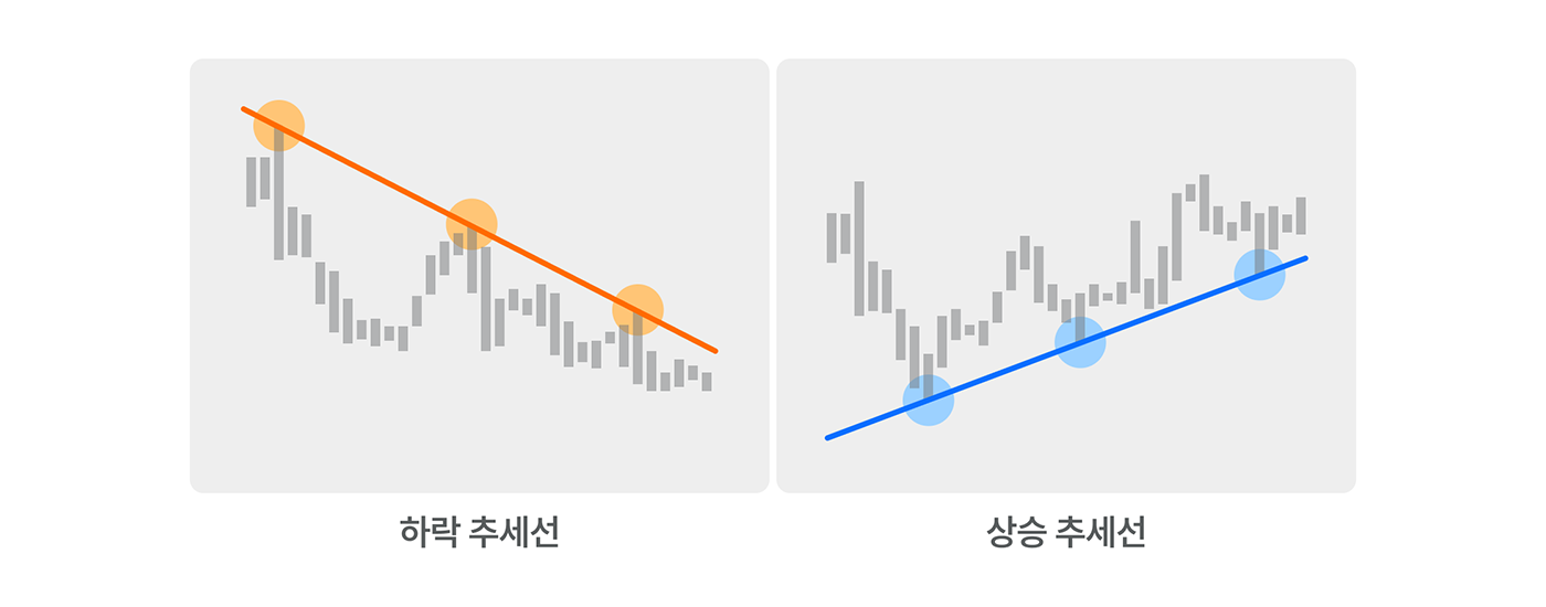추세선이란 : 주가를 장기적으로 보고 고점이나 저점을 연결해 그은 선이다.