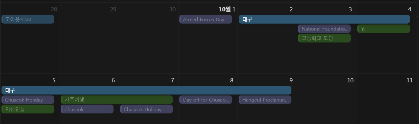 10월 2일부터 10월 9일까지 휴가+추석 연휴가 있었다