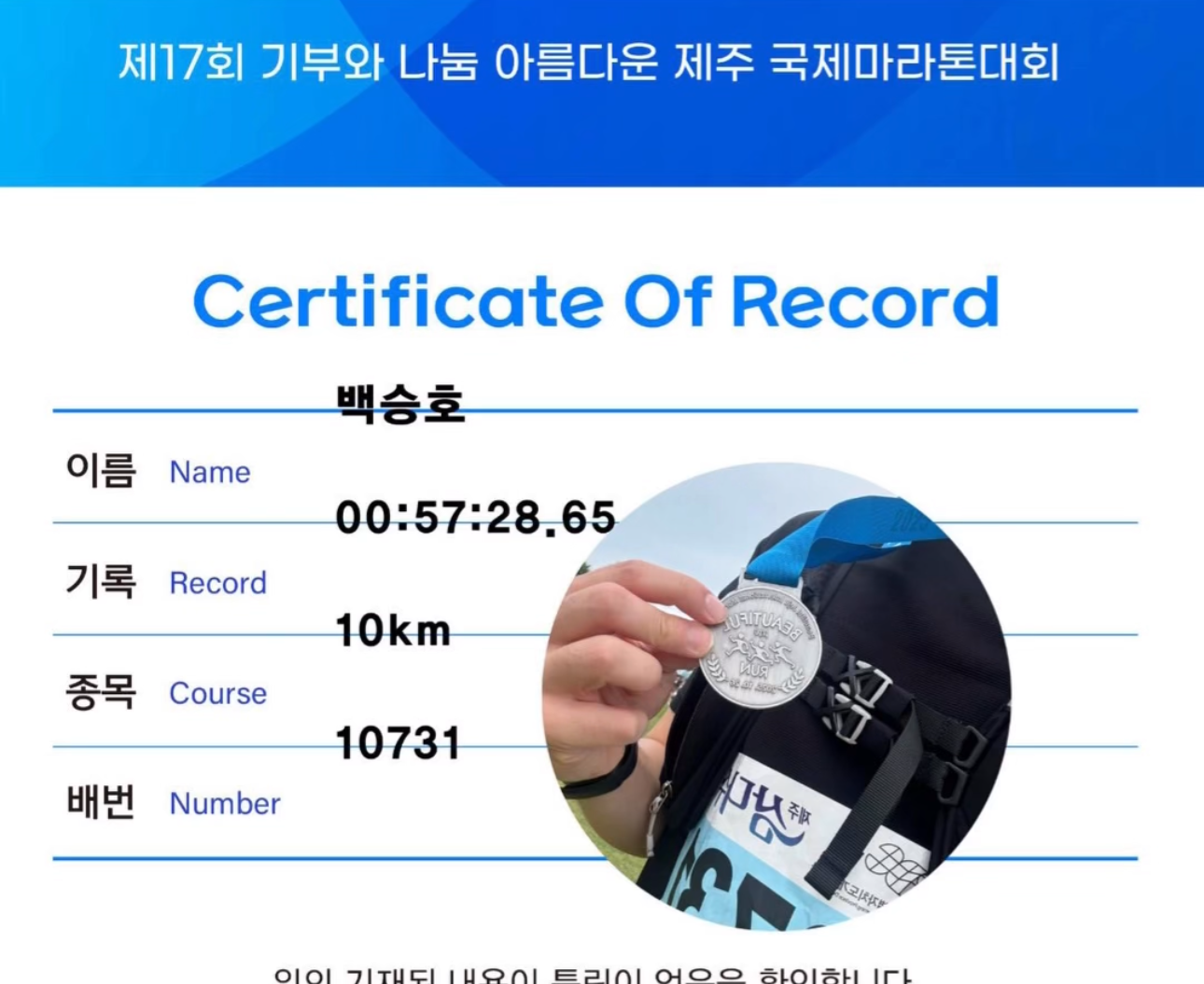 그런데 뜻밖에도 1시간 이내 완주라는 결과를 얻었다그날따라 컨디션이 좋았고, 같이 뛰던 사람들과 페이스를 잘 맞춰서 달릴 수 있었다 결승선에 도착해 기록을 보니 앞자리가 ‘5’였다